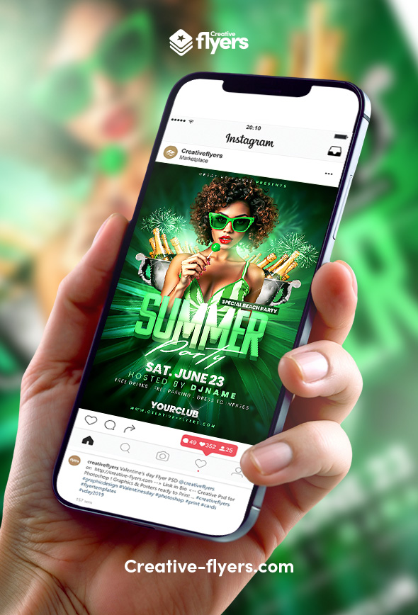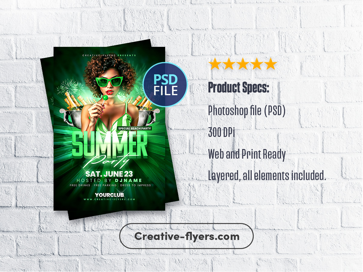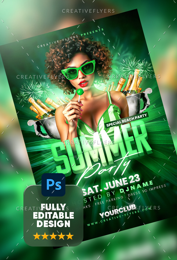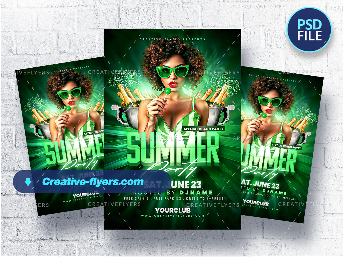 Crafting this flyer involved a vibrant green color scheme, a central image of a woman with a lollipop, and tropical elements like fireworks and champagne buckets. The text highlights a “Summer Party” … The overall design aims for a fun, energetic beach party invitation.