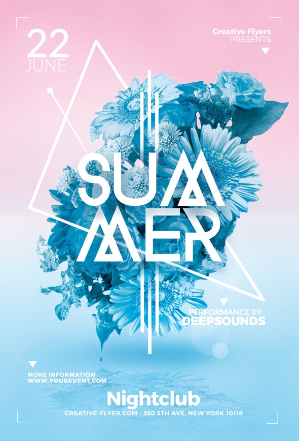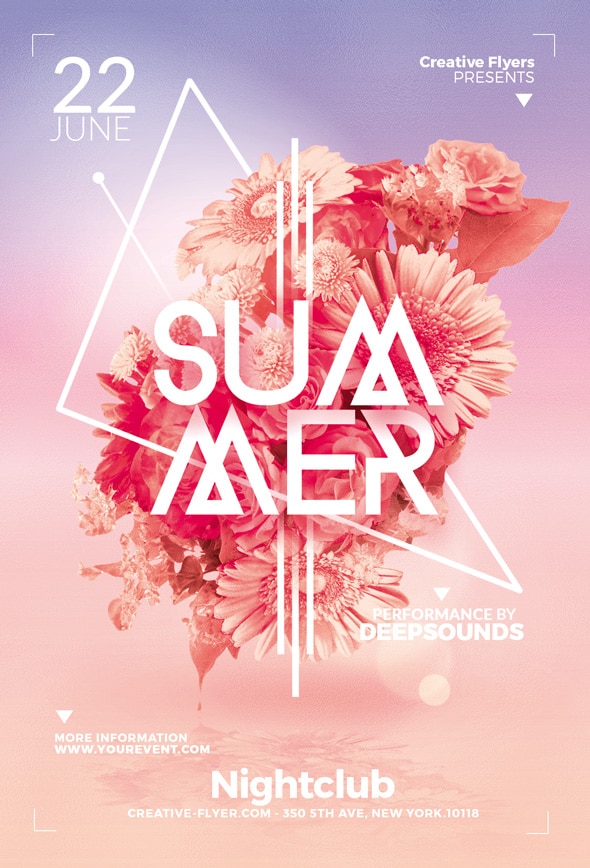 Designed to visually capture summer’s energy, this flyer merges bold flowers with white triangle graphics and minimalist fonts. The contrast between soft natural elements and sharp geometric forms results in a balanced and eye-catching visual. Perfect for events focused on art, music, or chill rooftop vibes.