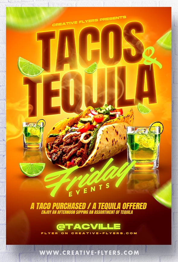 This flyer announces a “Tacos & Tequila” event, the flyer is dominated by an image of tacos and tequila. Bright colors and festive design create a friendly ambiance for spring and summer. The text is clear and readable. This Poster is an effective tool for promoting an event in a restaurant, bar or club.