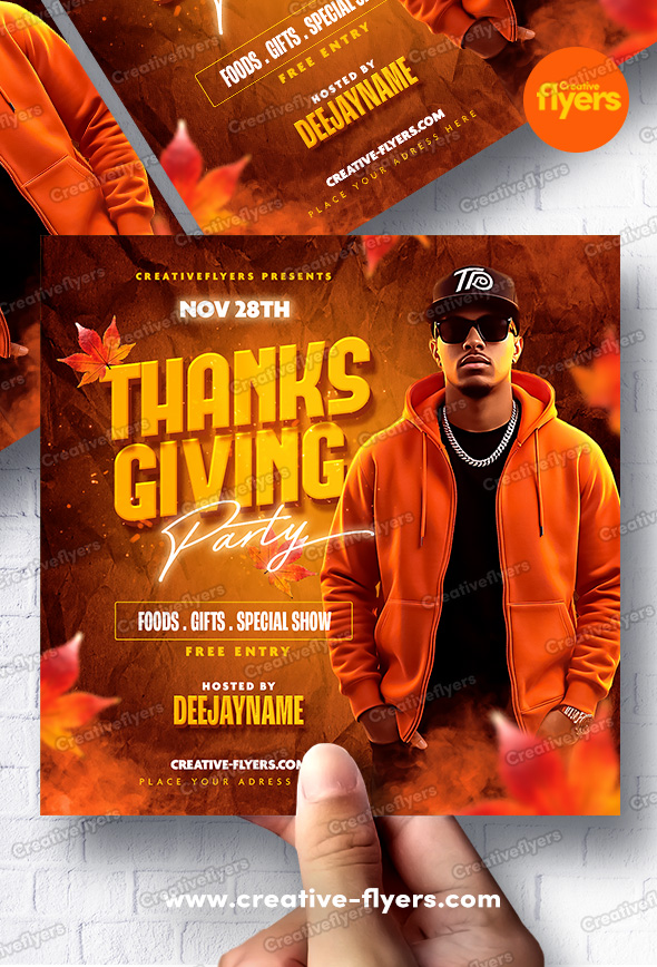 This flyer was designed to embody the vibrant and festive spirit of Thanksgiving. Warm orange and golden tones blend with autumn leaves to create a welcoming and energetic vibe. The modern typography and stylish lighting effects highlight the event details perfectly. Ideal for parties, club events, or seasonal gatherings.