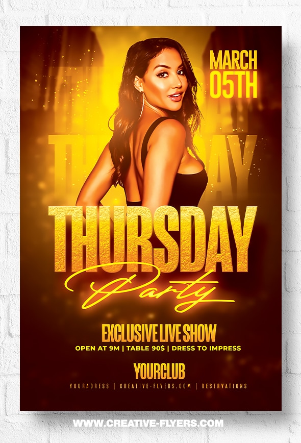 Photoshop flyer template in PSD format, created to advertise your next nightclub, bar, restaurant, showcase, concert or private party, a top notch design to edit with just a few clicks.