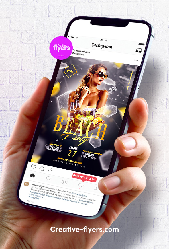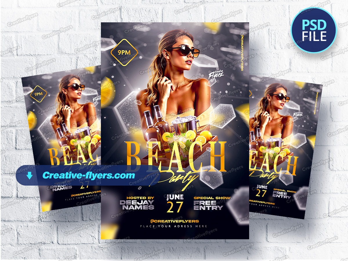 This flyer was created to promote an elegant summer beach party using a warm-toned palette and vibrant visuals. The confident woman in sunglasses sets a glamorous tone, while the cocktail tray filled with fresh drinks reinforces the tropical vibe. Light reflections, hexagon overlays, and sunset lighting give the flyer depth and atmosphere.