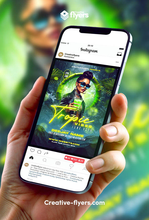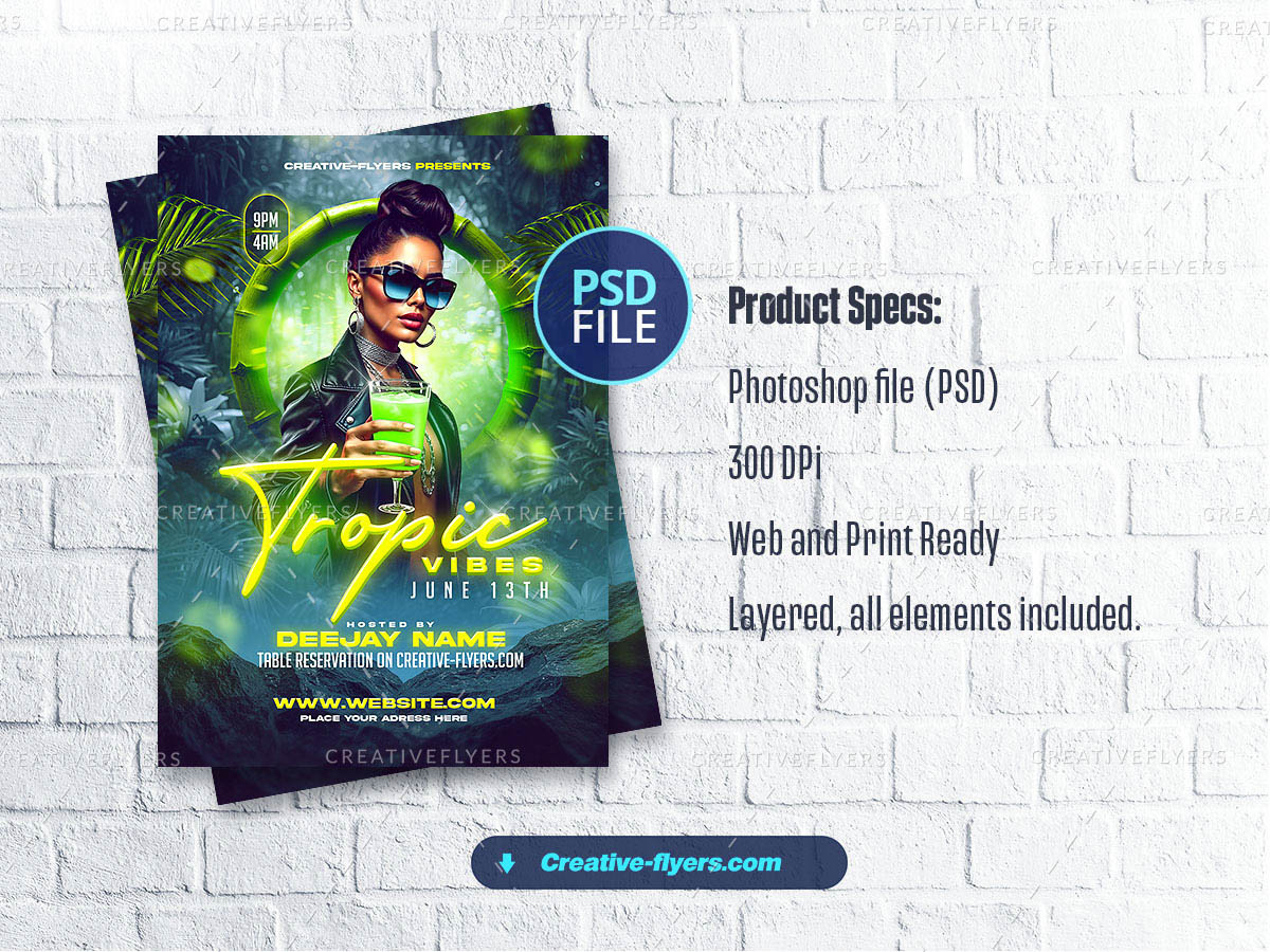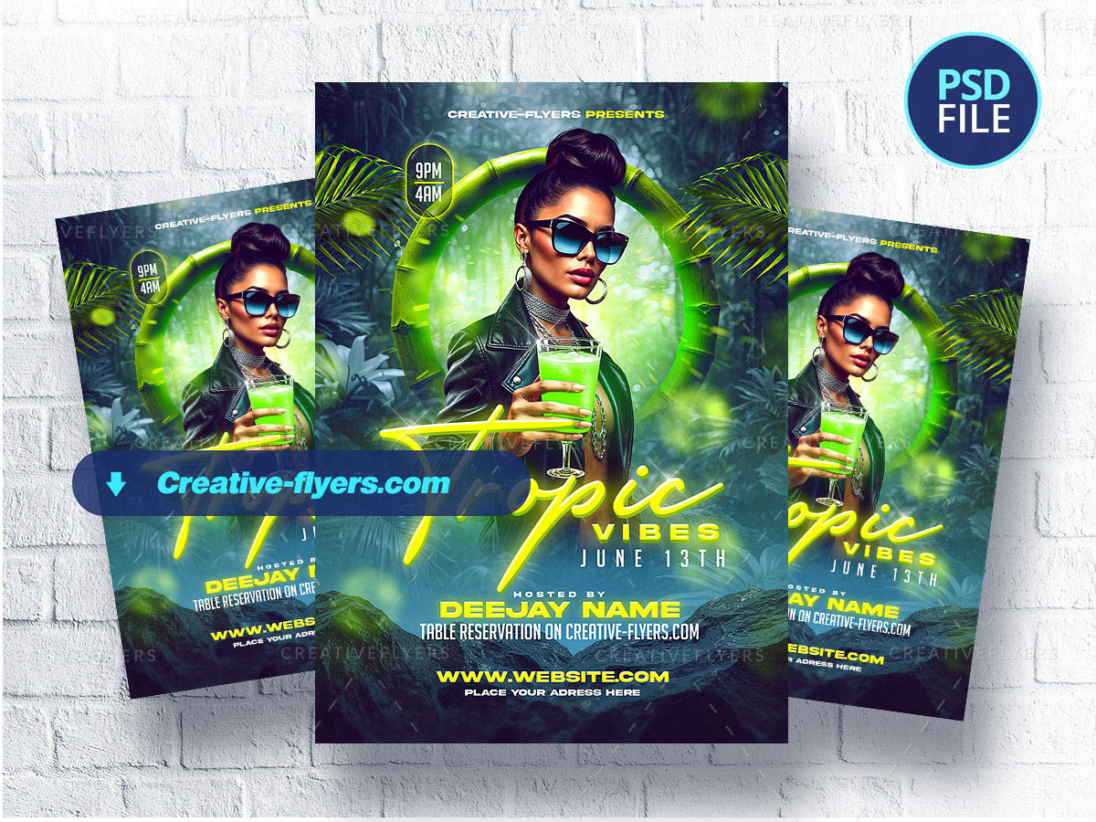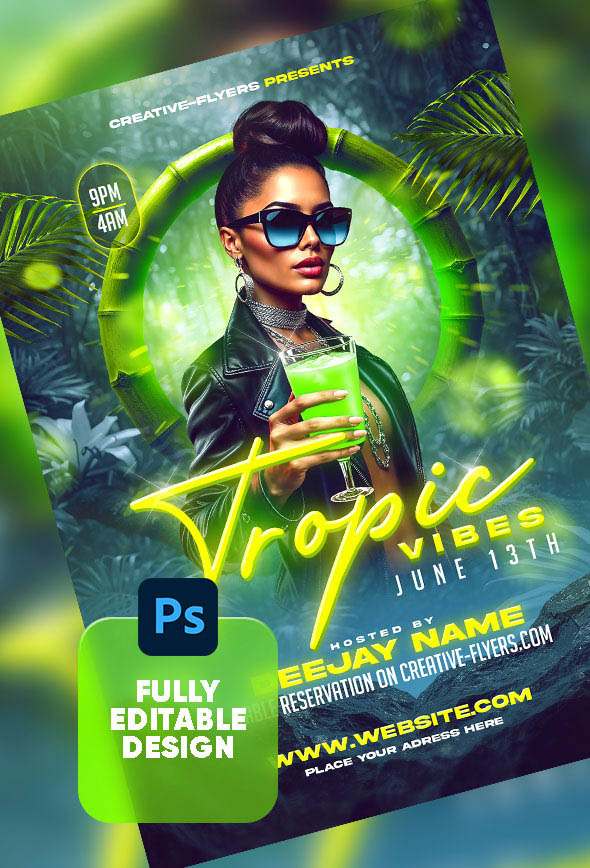 The design of this flyer aims to create an exciting and immersive tropical party invitation. The circular green bamboo immediately establishes the theme, while the surrounding foliage enhances the lush aesthetic. The central image of a fashionable woman with a vibrant drink adds a touch of glamour. The glowing yellow “Tropic Vibes” text stands out against the darker background. Key information is organized and easily readable, encouraging attendees to join the “Tropic Vibes” event. The color palette and imagery work together to evoke a warm, energetic, and tropical experience.