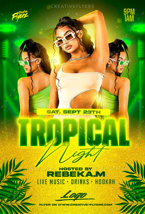 Vibrant, tropical-themed event flyer with a neon green and yellow color scheme. The layout features a central image of a woman. The background is a gradient of green with tropical leaves framing the bottom corners. The text is bold and eye-catching, with ‘TROPICAL NIGHT’ in large, yellow, block letters in the center. Perfect to promote Tropical party, shatta music event, Rnb and afro party or others…