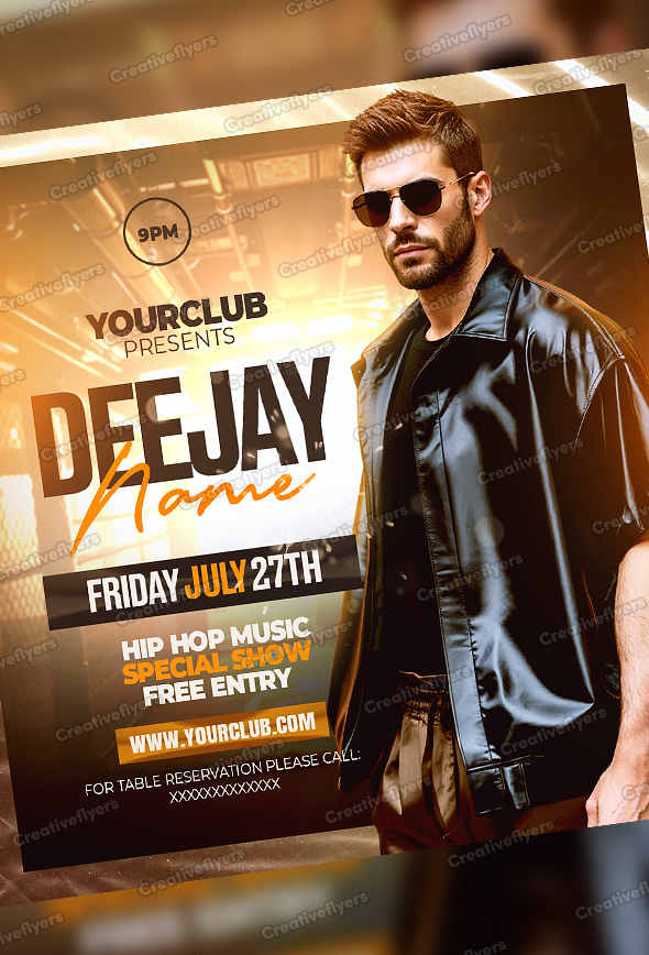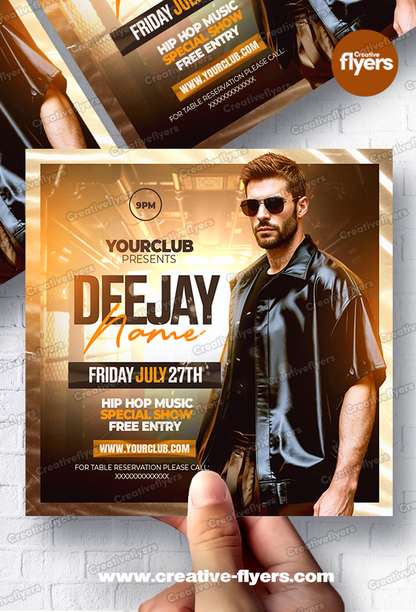 This flyer was designed for a hip-hop and club event using a masculine, stylish approach. The modelโs leather jacket and sunglasses suggest cool, night-out energy. A warm amber gradient adds intensity, while the typography stands out with contrasting fonts and colors like orange and black. It’s bold, clear, and tailored for nightlife promotions.