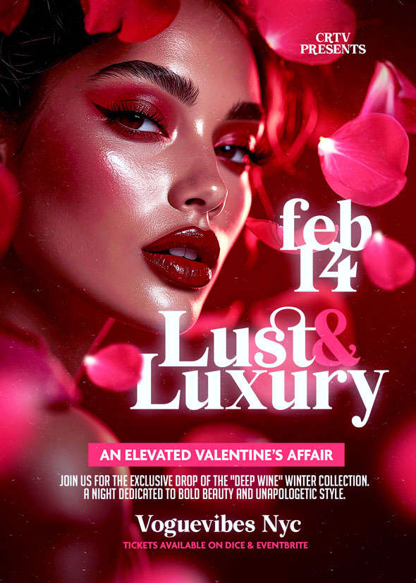 This creation focuses on high-contrast lighting and a monochromatic red palette to evoke passion. By layering floating rose petals with a soft-focus depth of field, we achieve a 3D immersive effect. The typography uses a mix of elegant serifs and modern sans-serifs to balance sophistication with accessibility, perfectly capturing the “Lust & Luxury” theme for a premium fashion event.