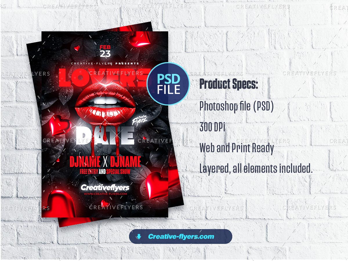 Digital flyer with a bold and vibrant design, featuring a dark background with red and black tones. The central focus is a pair of glossy red lips, creating a striking visual. Surrounding the lips are red 3D heart shapes, adding a romantic theme, perfect for valentine’s day event. The text is prominently displayed in various styles: ‘LOVERS’ in large, bold red letters with a glossy effect, ‘DATE’ in white, indicating a music event. The design is dynamic and eye-catching, designed to attract attention to the event details.