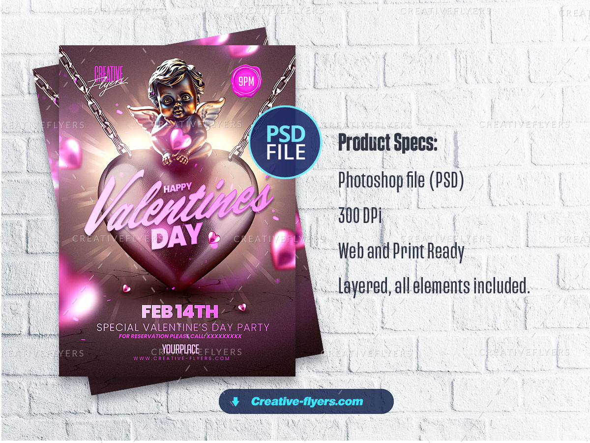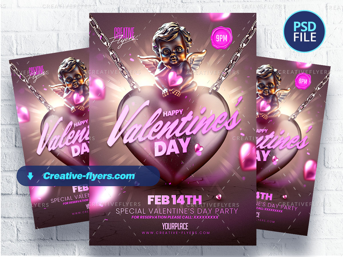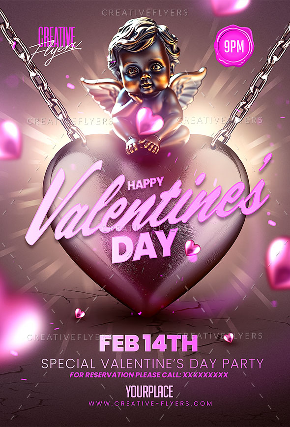 This elegant Valentine’s Day flyer features a metallic heart adorned with pink neon text and surrounded by glowing heart shapes. A golden cherub sits atop the heart, symbolizing love and celebration. The vibrant pink and purple hues create a captivating atmosphere. Event details such as “Feb 14th” and a reservation contact are highlighted, making it ideal for promoting unforgettable Valentine’s Day parties.