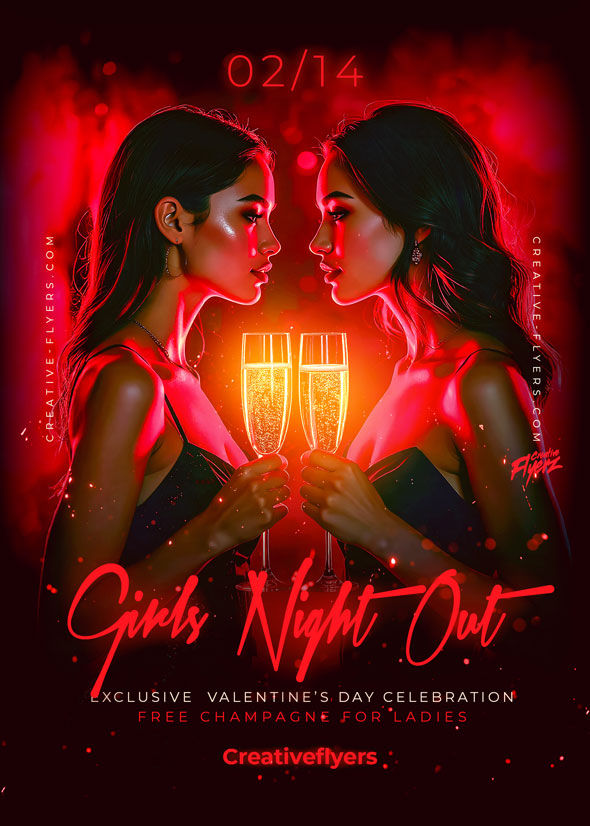 This flyer leverages a striking dual-tone aesthetic, contrasting deep crimson shadows with a brilliant golden glow from the champagne flutes. The symmetrical composition of the two women creates a balanced, high-fashion look. Using a mix of elegant serif fonts and bold, handwritten scripts, the design is fully customizable, making it perfect for upscale lounges, nightclubs, or private Valentine’s events.