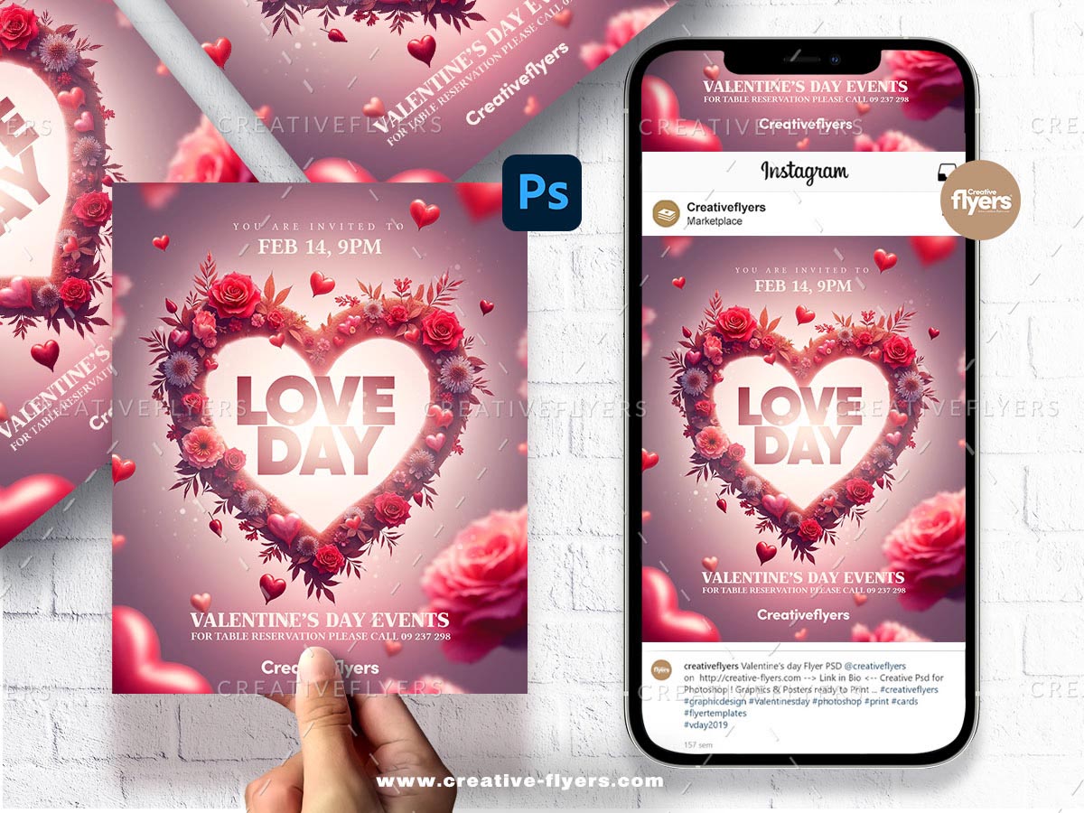 Digital flyer with a romantic theme, featuring a central heart shape made of red roses and other flowers, set against a soft gradient background transitioning from light pink to white. The middle of the flyer prominently features the words ‘LOVE DAY’ in large, bold, uppercase letters, with a slight shadow effect, creating a 3D appearance. The overall design is adorned with floating red hearts and petals, enhancing the romantic and festive atmosphere.