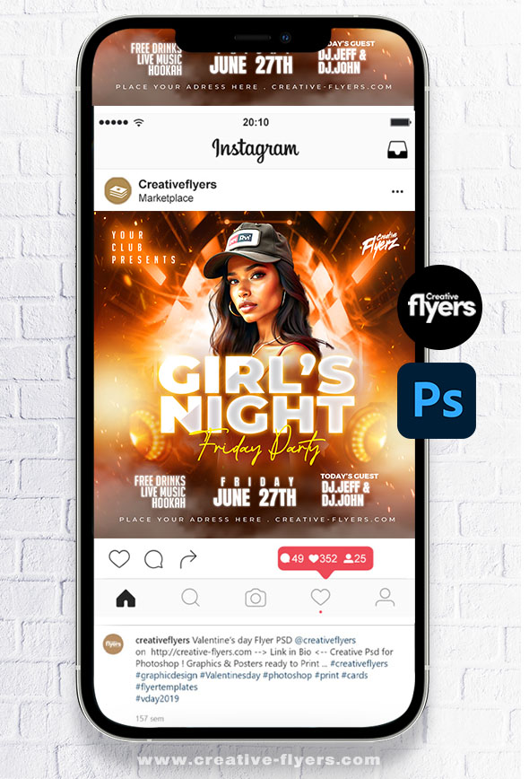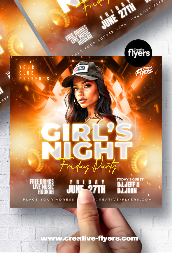 Vibrant and stylish event flyer for a ‘Girl’s Night Friday Party.’ The layout features a central image of a woman wearing a black cap . The background is a dynamic mix of orange and yellow hues with light flares, creating an energetic atmosphere. The text is bold and white, with ‘Girl’s Night’ prominently displayed in large, uppercase letters. Perfect to promote a Girls party, ladies night, hip hop or Rnb Party, urban music events…