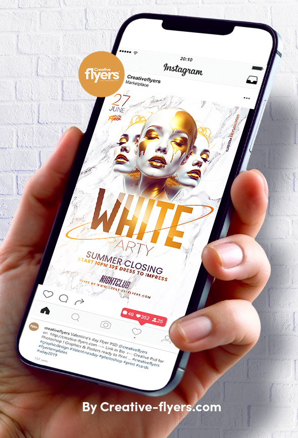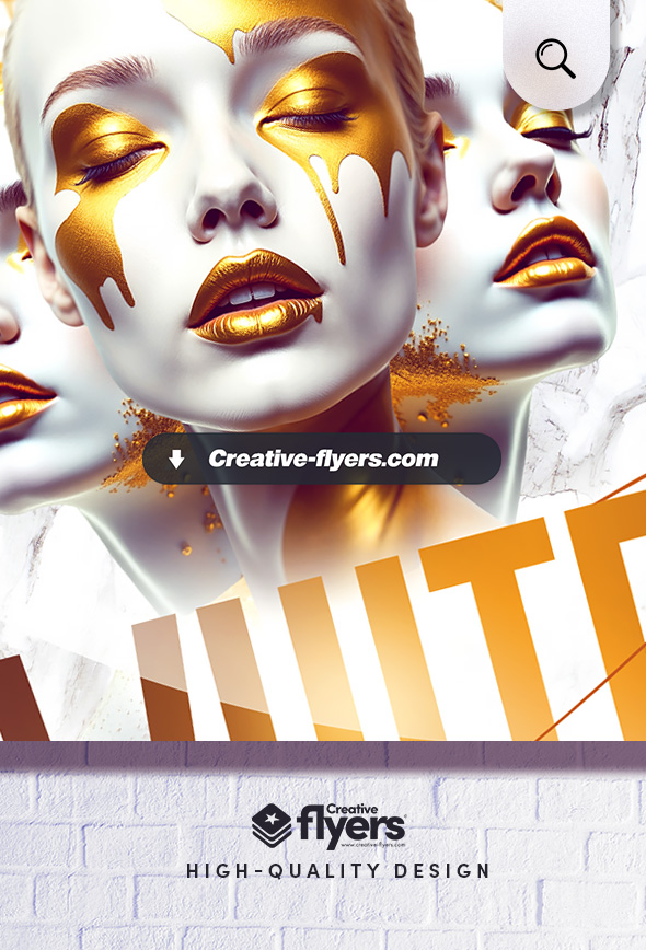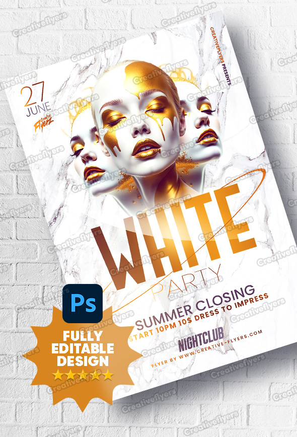 This flyer was crafted with a marble background and golden artistic effects to highlight elegance and exclusivity. The central model design, with gold paint elements, conveys creativity and luxury. Strong typography contrasts with minimal background to ensure clarity and impact. The result is a refined promotional flyer, perfect for upscale white party events or nightclub summer closings.