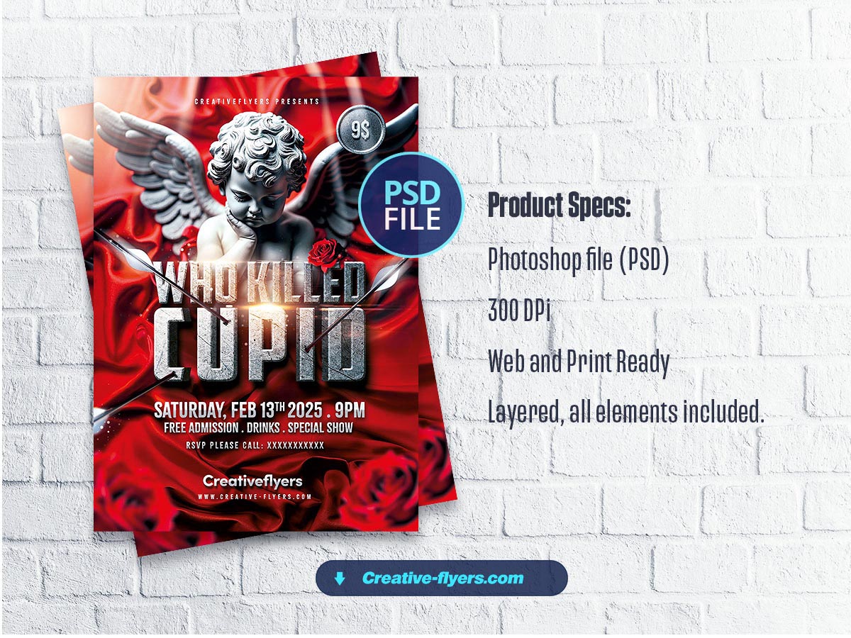Promotional flyer with a dramatic and artistic style. The background is a vivid red with swirling patterns, creating a sense of movement. At the center is a grayscale statue of a cherubic figure with wings, holding a finger to its lips, suggesting secrecy or silence. The cherub has curly hair and a serene expression. Overlaying the image is bold, metallic text in a distressed font that reads ‘WHO KILLED CUPID,’ with a red rose accentuating the word ‘CUPID.’ an elegant flyer to announce Valentine’s Day in an original way…