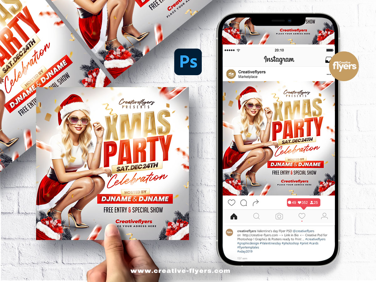 Festive promotional flyer with a vertical layout, featuring a vibrant and eye-catching christmas design. The central subject is a woman, wearing a Santa hat, a white top, and a red skirt. The background is a gradient of white and gold, adding a festive touch. The text is bold and prominent, with ‘XMAS PARTY’ in large, metallic 3d letters effects. The overall design is festive and inviting, perfect for a holiday party announcement.